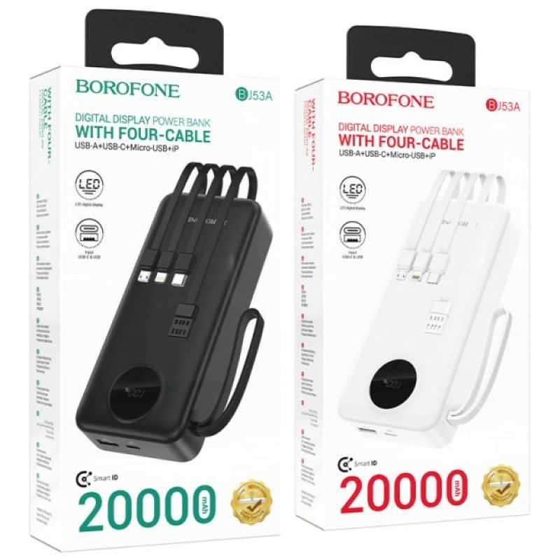 Borofone BJ53A tashqi akkumulyatori 20 000 mA/soat quvvatga ega kuchli va ko'p qirrali zaryadlovchi hisoblanadi. Smartfonlar, planshetlar, minigarnituralar va boshqa mobil qurilmalarni zaryadlash uchun ideal.