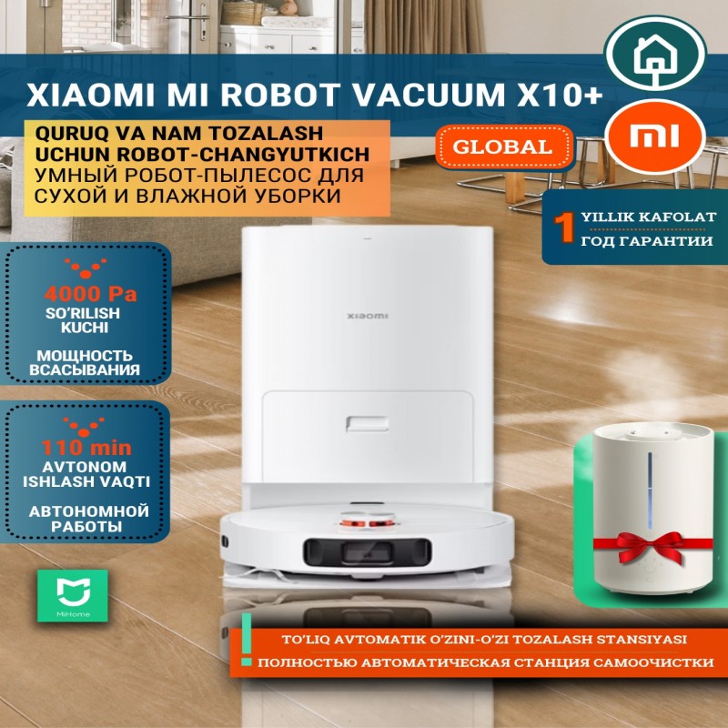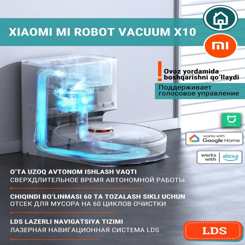 • Xiaomi Robot Vacuum X10+ robot changyutgichi noyob funksiyalari: orientirlanish, changni avtomatik tozalash, nakladkalarni yuvish va issiq quritish tufayli sizni kundalik ishlardan ozod qiladigan innovatsion yordamchidir